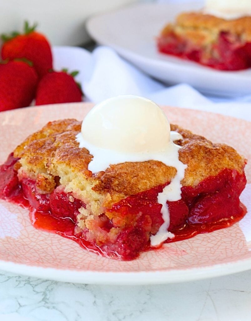 If you’re after an easy, crowd-pleasing dessert that’s full of fresh flavor, this strawberry cobbler is it! Juicy, sweet strawberries are baked beneath a golden, buttery topping that’s soft on the inside with just the right amount of crunch on top. Serve it warm with a scoop of vanilla ice cream, or enjoy it chilled straight from the fridge!